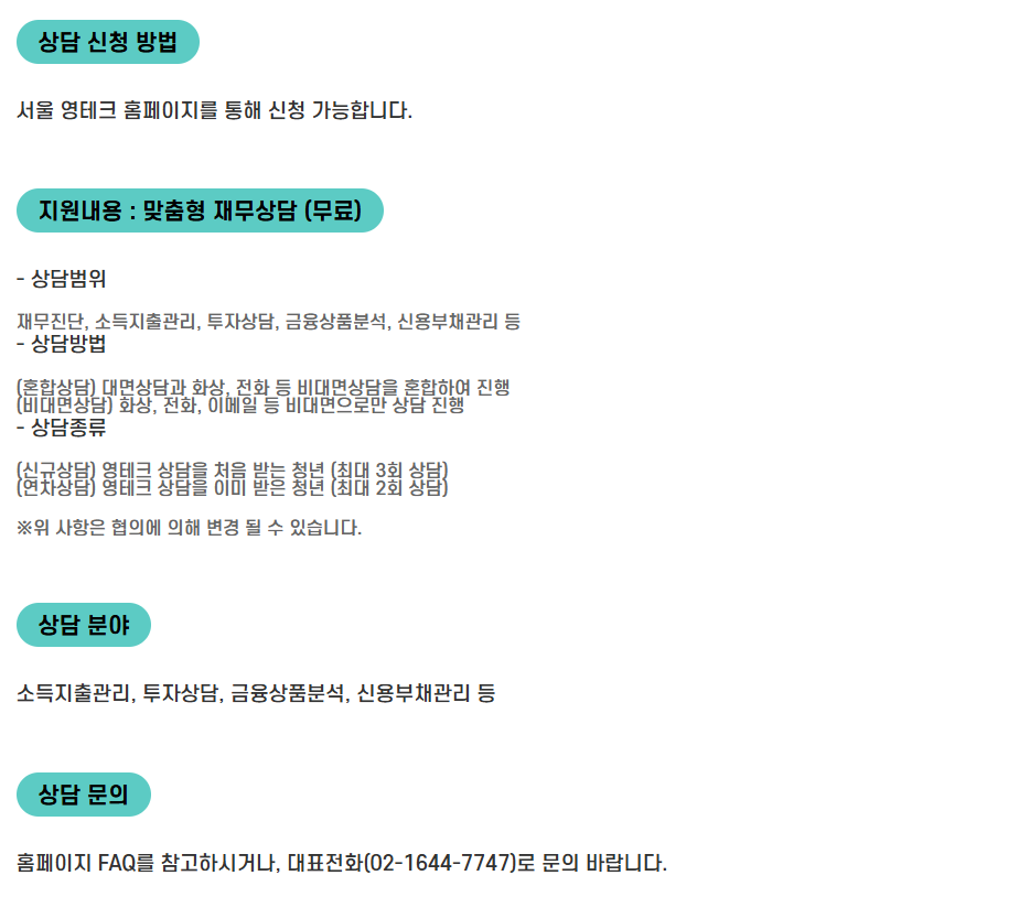 서울 영테크 재무 상담은 단 1회만 받아도 인생 재정이 확 달라진다는 후기들이 많습니다. 이처럼 서울 영테크는 단순한 상담이 아닌 청년을 위한 실질적인 돈 관리 전략을 제시하는 도우미입니다.