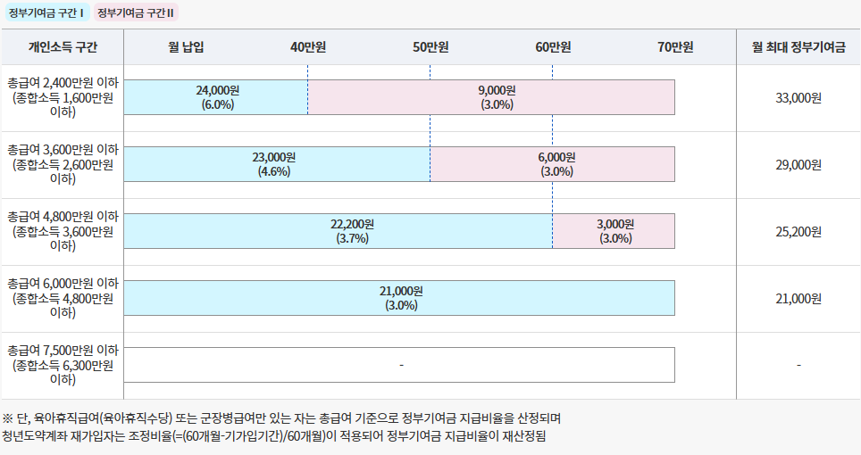 - 매월 입금 금액 기준으로 정부 기여금 차등 적용